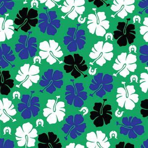 The Hibiscus flower is often worn by women during special occasions and is a symbol of femininity, beauty, and resilience. This striking print features a lush green background, adorned with contrasting white, black, and deep blue hibiscus flowers and Dharis.
