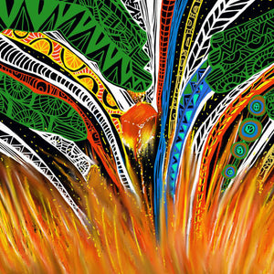 The artwork depicts the hands of an elder carefully nurturing a glowing ember, symbolising the sacred act of passing down cultural wisdom and traditions to the younger generation, ensuring the continuity of Indigenous identity and pride.