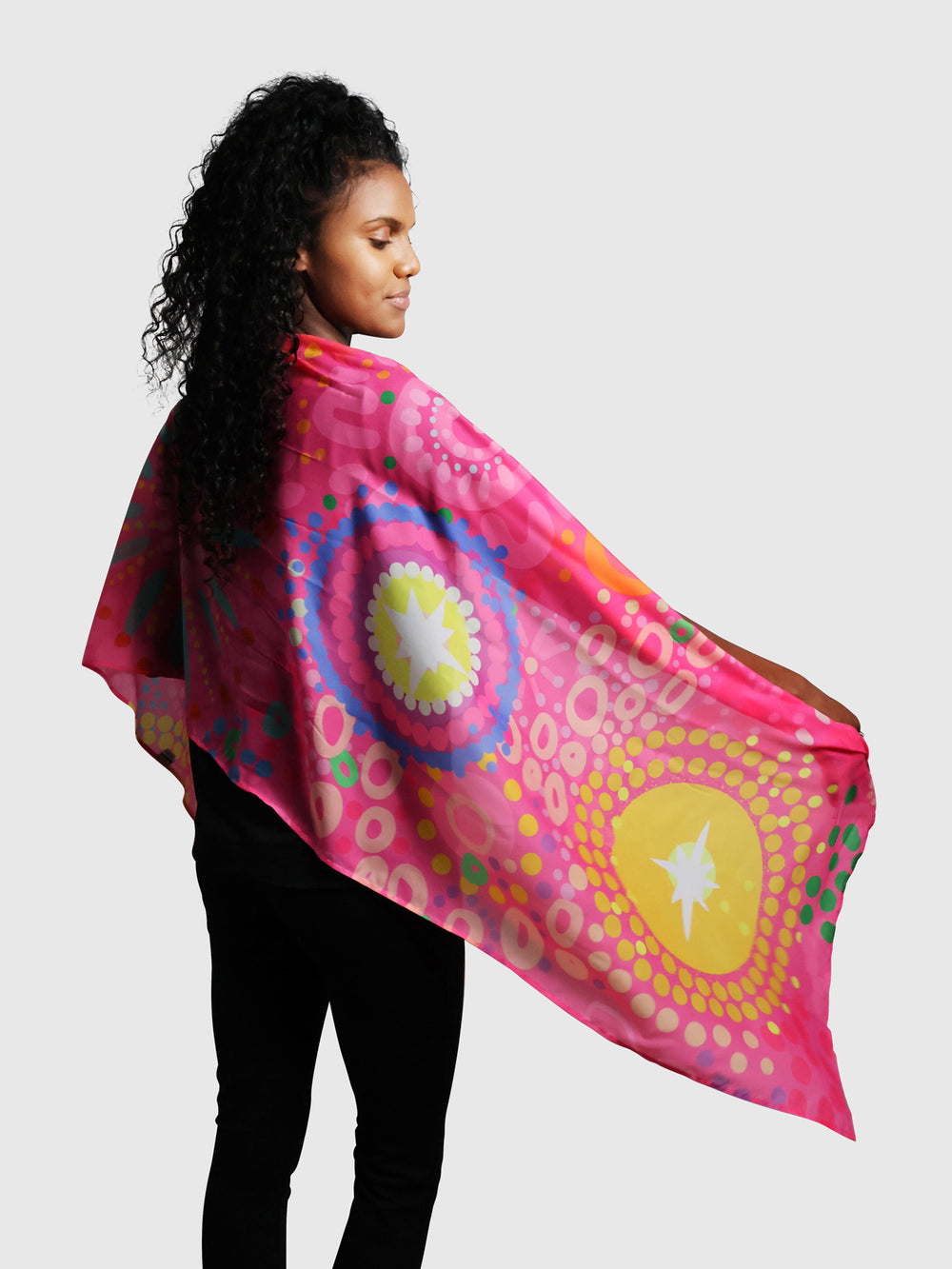 Celebrate NAIDOC Week 2025 with our limited edition scarves. Measuring a generous 180x60 cm, and crafted from a lightweight chiffon blend, these scarves drape beautifully and provide versatile styling options. Perfect for adding meaningful style to any outfit, each scarf is a wearable celebration of Indigenous excellence and culture. Style it around your shoulders, as a headscarf, or adorning your bag - the possibilities are endless!