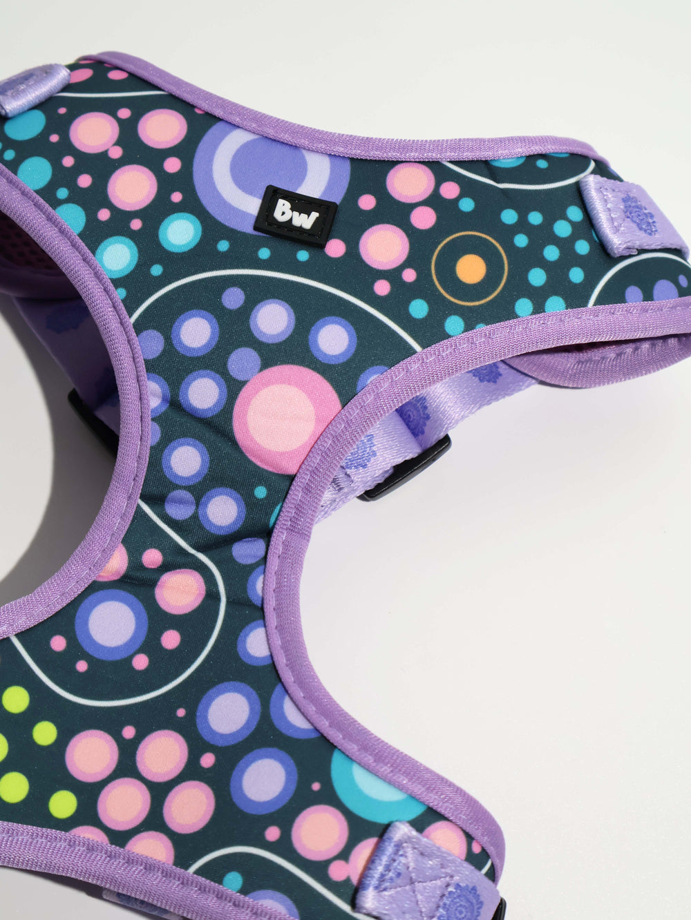 Unleash your pup's Aussie style with our Indigenous Australian art dog harnesses. Made from tough polyester, these harnesses provide a safer and more comfortable walking experience. By distributing pressure evenly across the chest and shoulders, harnesses can help alleviate back pain and reduce the risk of throat damage caused by pulling on a traditional collar.