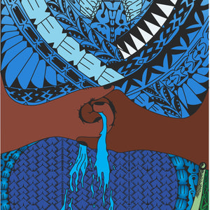 The dhoeri and didgeridoo represent our dances and songs, which can aide in healing our land. We are resilient people, who connect spiritually to our country and Islands through our kinship, language, traditions and Lore, this entwines our First Nation people. The different totemic/clan designs represent our identity. The hands with the pouring of water symbolise cleansing and regrowth, in harmony for the future generation of our people.