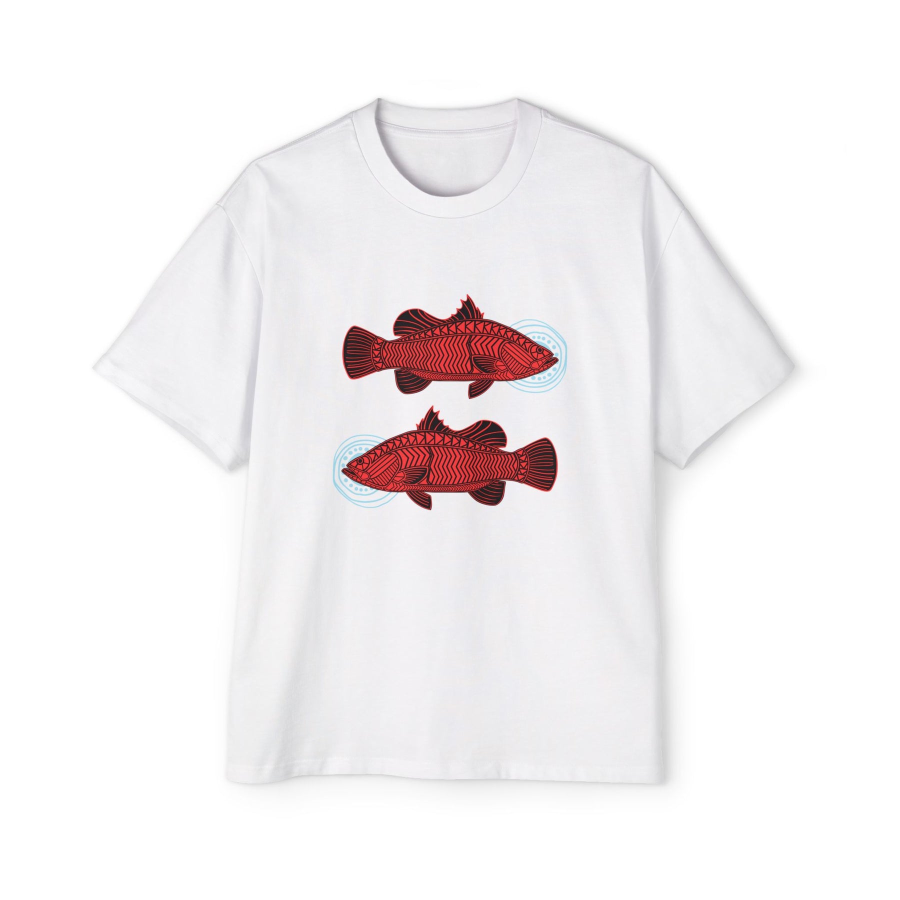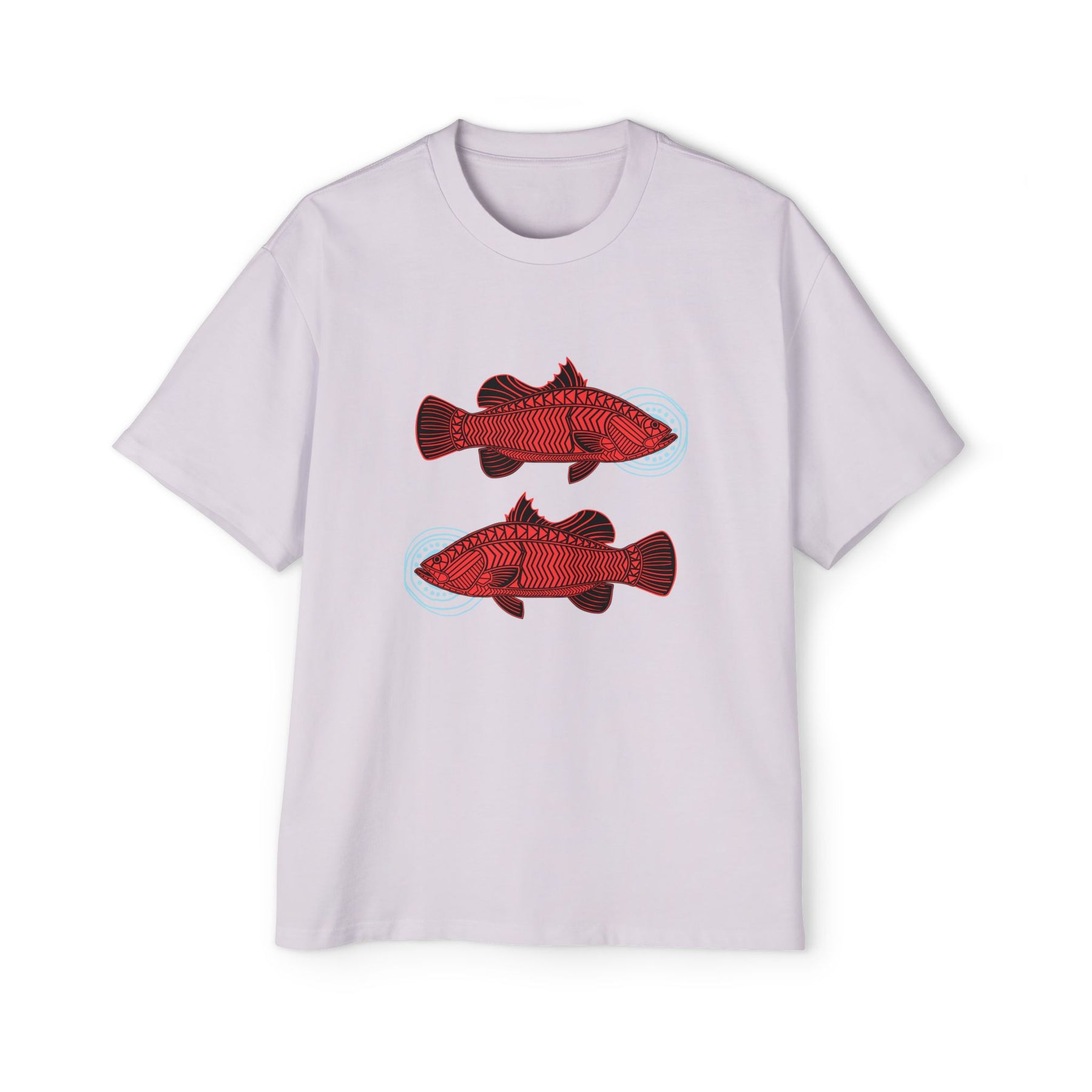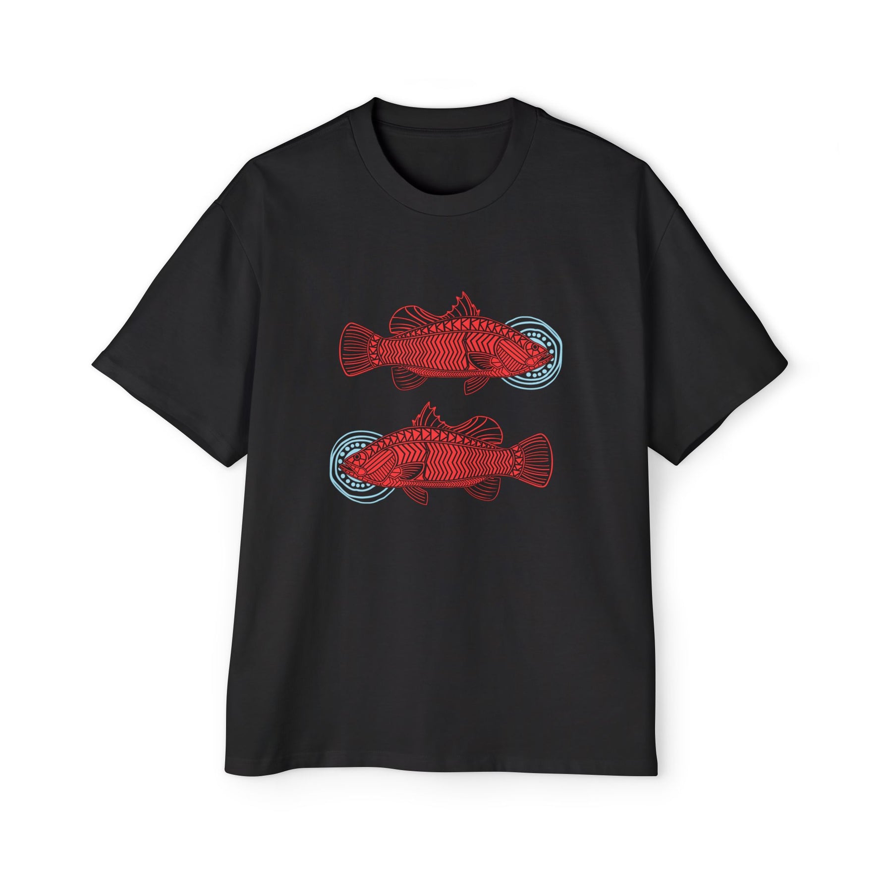 "Barramundi are highly adaptable and can survive in both salt and fresh water. The opposite-facing barras represent the many different decisions that affect our lives. The blue circular motifs symbolise separate life pathways that determine individual outcomes. The artwork also highlights the importance of making positive choices, which affect the environment and, consequently, our lives."