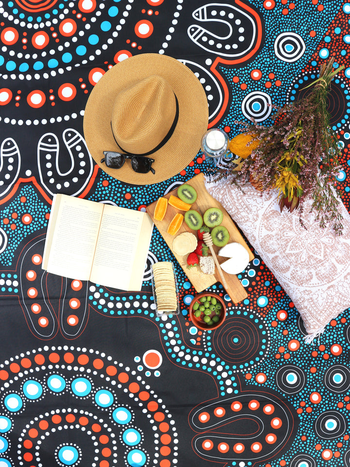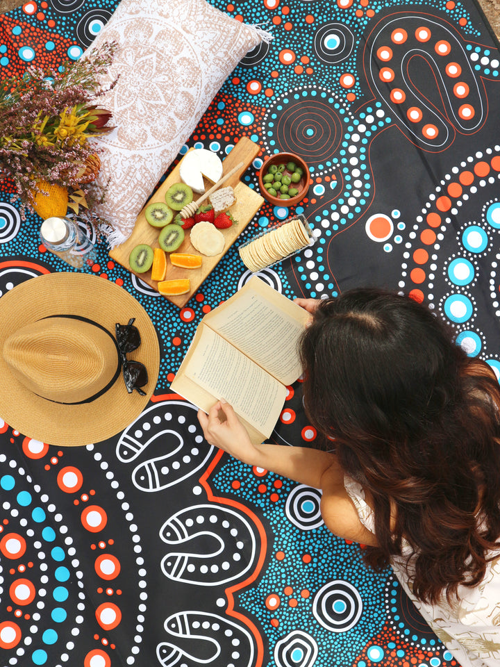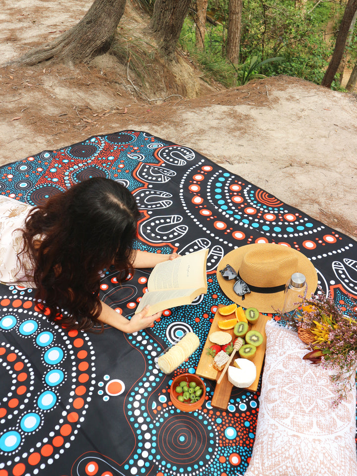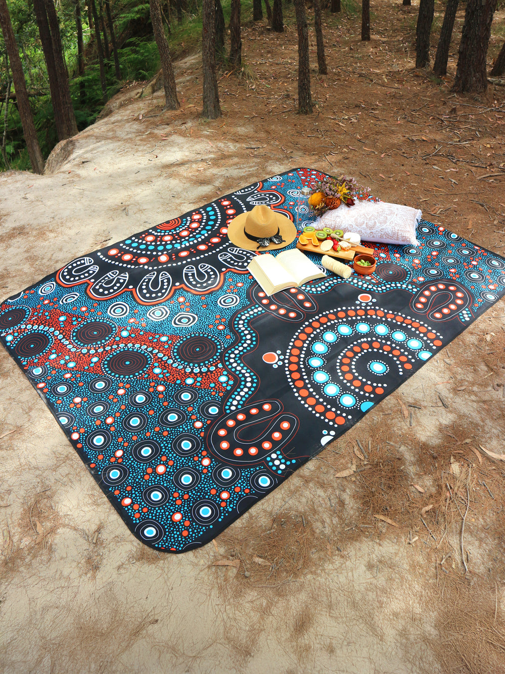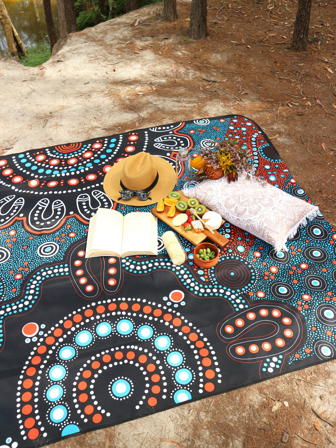 Discover the perfect companion for your outdoor gatherings with our outdoor picnic mats, featuring six stunning Indigenous Australian art designs.