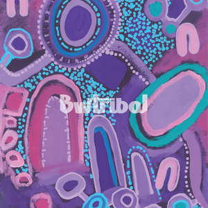With rich purples and blues as the dominant colours, the piece features interconnected abstract shapes and symbolic motifs, representing gatherings, relationships, and the shared space of the community. Dotted pathways and flowing lines suggest movement and connection, while the bold contrasting shapes in pink, teal, and aqua signify the diversity and unity found in Aboriginal groups.