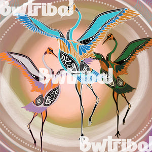 This artwork is depicting the dance of the Brolga. The dance preformed by the brolga is a courtship ritual which involves jumping up to a meter in the air with outstretched wings as well as walking, bowing and bobbing their head. They also have a loud trumpet-like call which is used attract a mate. There are tribals which depict the brolgas dance which was usually preformed at corroboree meeting places. Many tribal dances come from native animals.