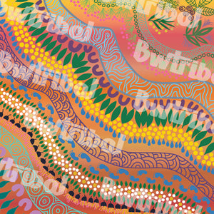 Drawing inspiration from the aftermath of ravaging bushfires, this piece features hues reminiscent of fiery trails amidst a backdrop of flourishing vegetation taking root - lemon myrtle, tea tree, wattle, and dianella - beacons of revival symbolising the resilience of our bushland and its medicinal wonders.