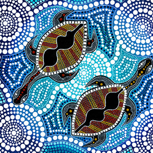 Yakans - This is a painting depicting the Yakans (which is the Noongar word for long neck turtles) journey. The circles represent the ngamar (waterholes) and the white lines connecting them show the movements and spirit of the Yakans. As they travel together to lay their eggs around pinjars (lakes)