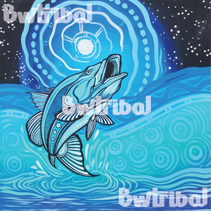 A majestic Barramundi fish leaping out of the water against the backdrop of a full moon.The Barramundi, rendered in intricate blue and white patterns, swims through a series of concentric circles emanating from the moon. These circles, reminiscent of ripples on the water's surface, create a sense of movement and energy, drawing the viewer's eye toward the central figure of the fish.