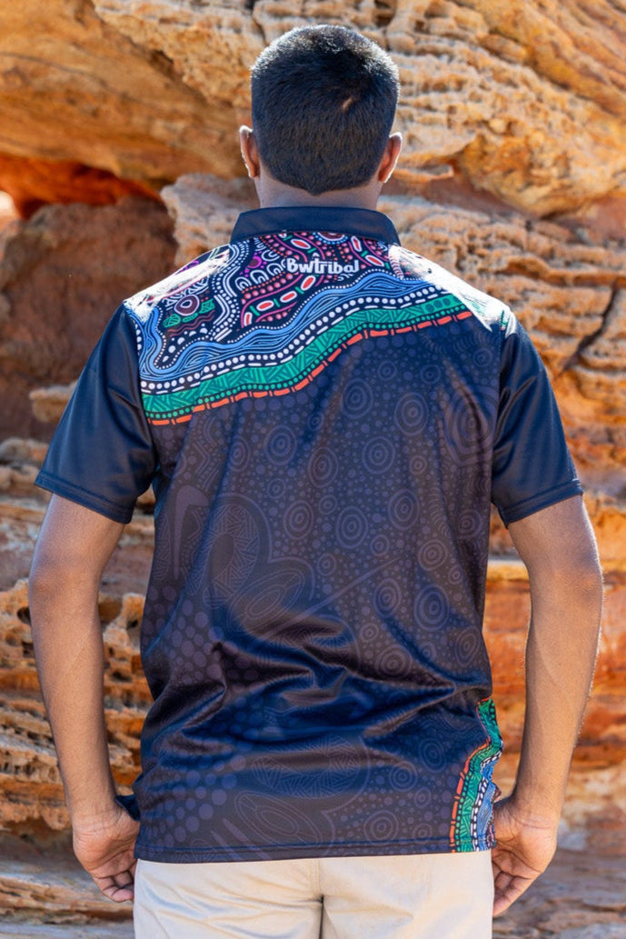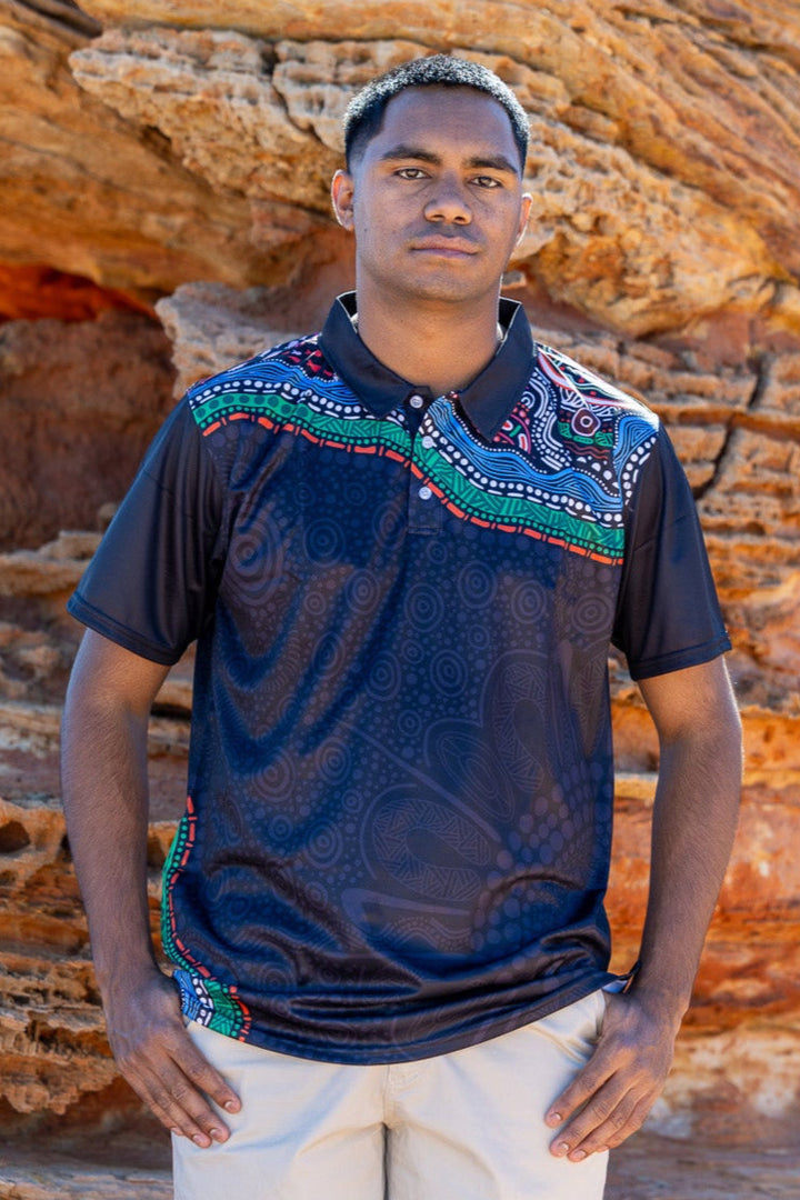 Made with Coolpass polyester, our Aboriginal art men's polos provide UPF 50+ protection and resists fading. The moisture-wicking, odour-resistant properties make it perfect for long-term outdoor use. They're lightweight, durable, and quick-drying. Plus, no ironing required. And the biodegradable packaging shows our commitment to protecting the land. Stay cool, stylish, and sustainable with our men's polos! 100% ally-friendly!