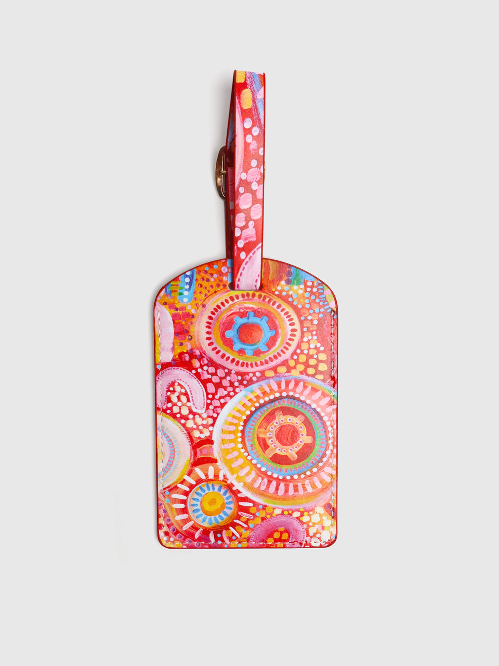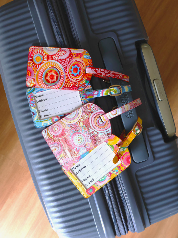 Keep your luggage easily identifiable with our Indigenous art travel luggage tags. These durable tags feature a clear card holder measuring 11cm x 6.8cm, perfect for displaying your contact details, and a secure 20cm strap. Each tag showcases vibrant Indigenous artwork, making your bags instantly recognisable while celebrating Australian culture.
