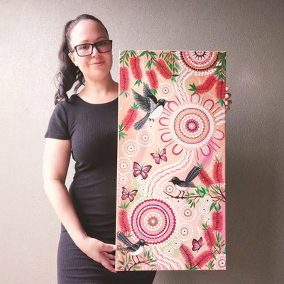 Sharla's contemporary style bursts with colour, bringing native flora and fauna to life through bold acrylics. Each piece weaves together family stories, personal experiences and cultural identity – creating art that speaks to both her heritage and her role as a mum passing culture to the next generation.