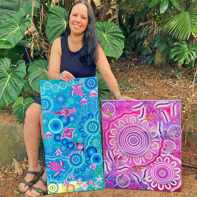 Self-taught and fuelled by coffee and bikkies, Sharla's already sharing her culture globally, with collectors from Canada to the US. Her goal? Simple – to bring joy through her art, one colourful canvas at a time.