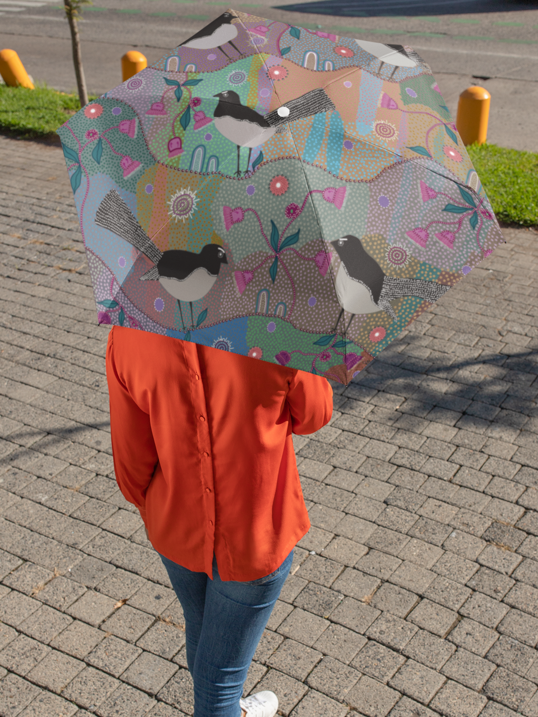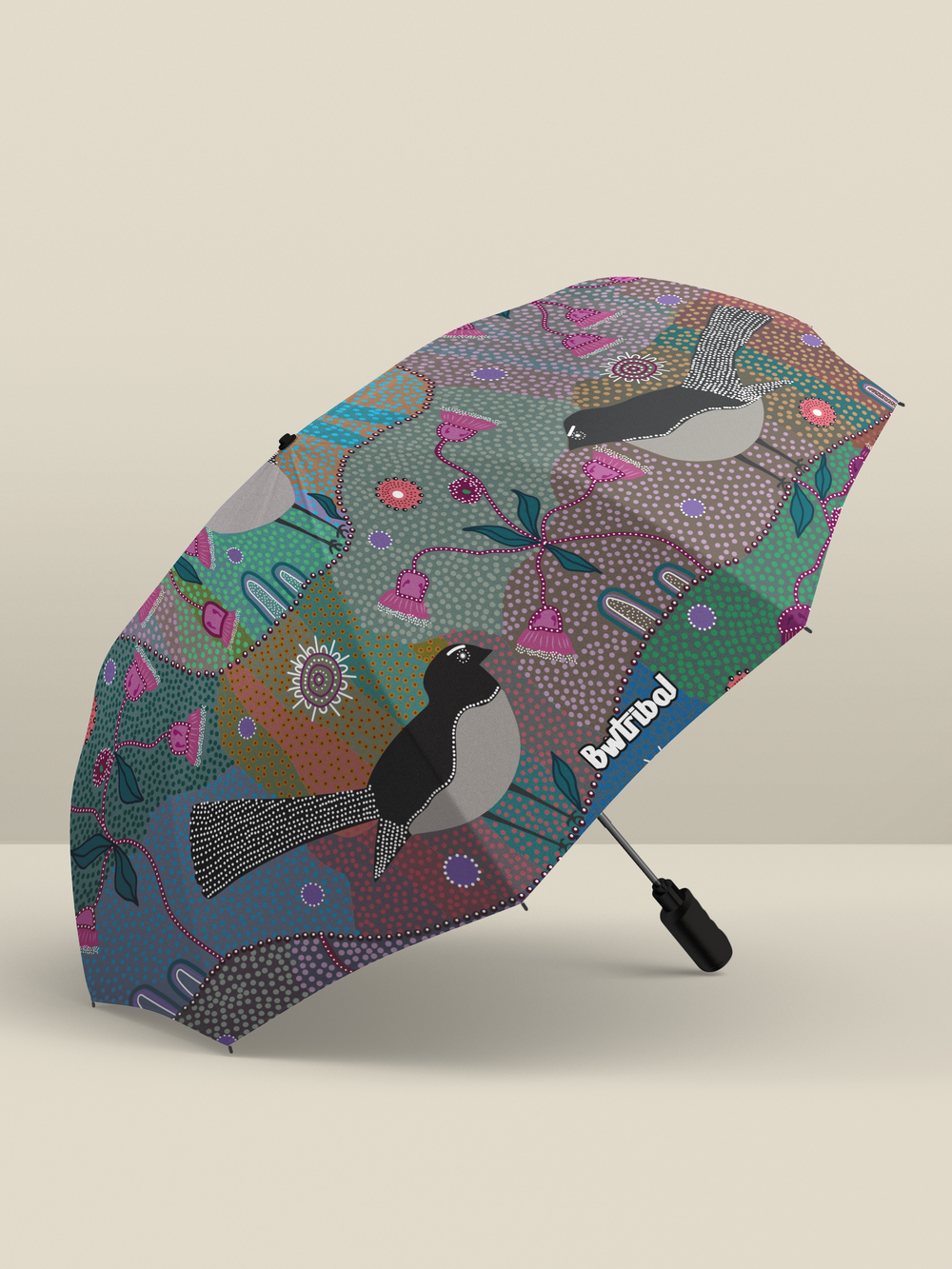 Our umbrellas showcase vibrant artwork from our talented First Nations artists on high-quality pongee fabric. Engineered for reliability, these umbrellas feature a superior wind-vent system and robust fibreglass frame that stands up to challenging weather.