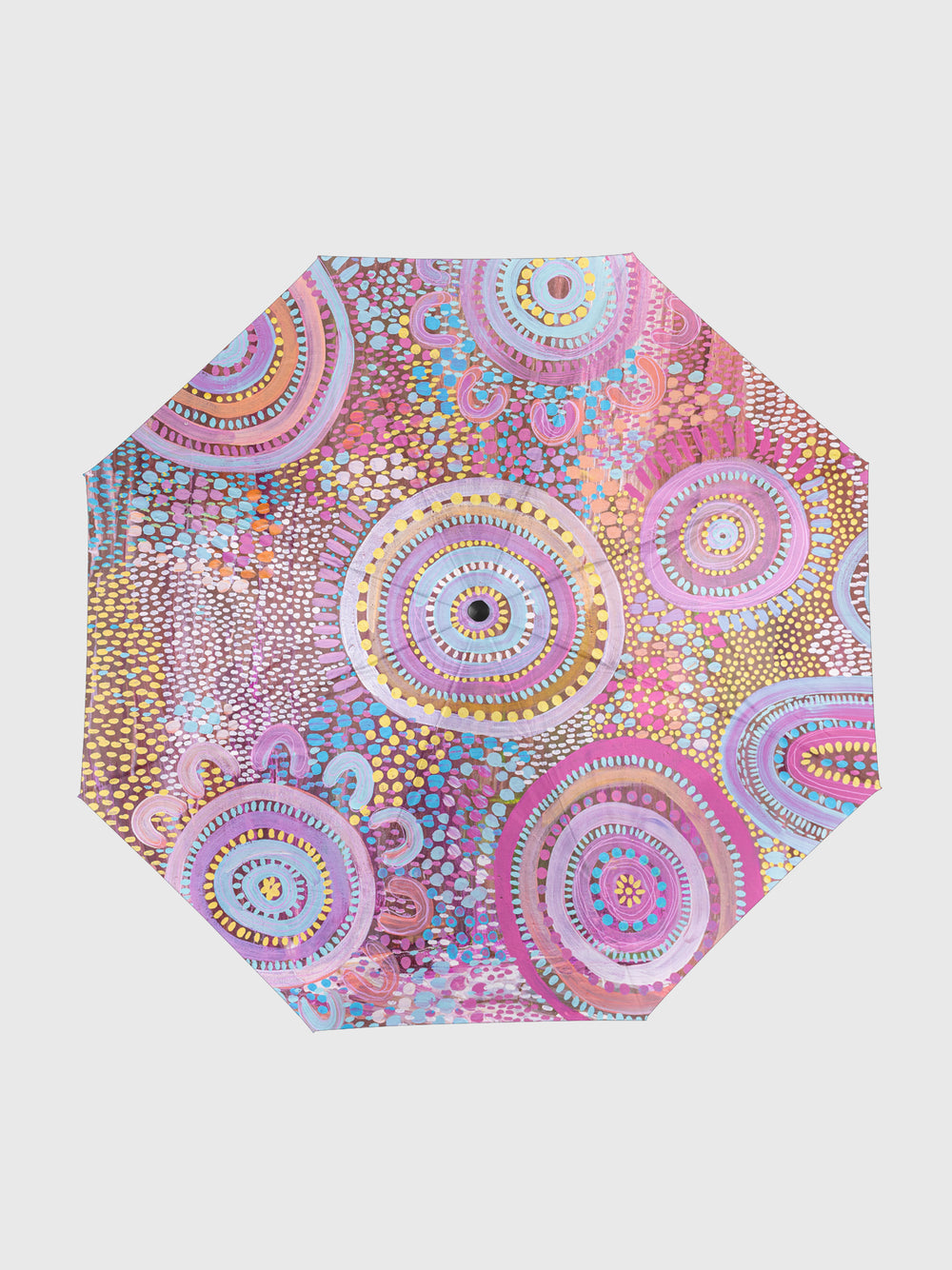 Our umbrellas showcase vibrant artwork from our talented First Nations artists on high-quality pongee fabric. Engineered for reliability, these umbrellas feature a superior wind-vent system and robust fibreglass frame that stands up to challenging weather.