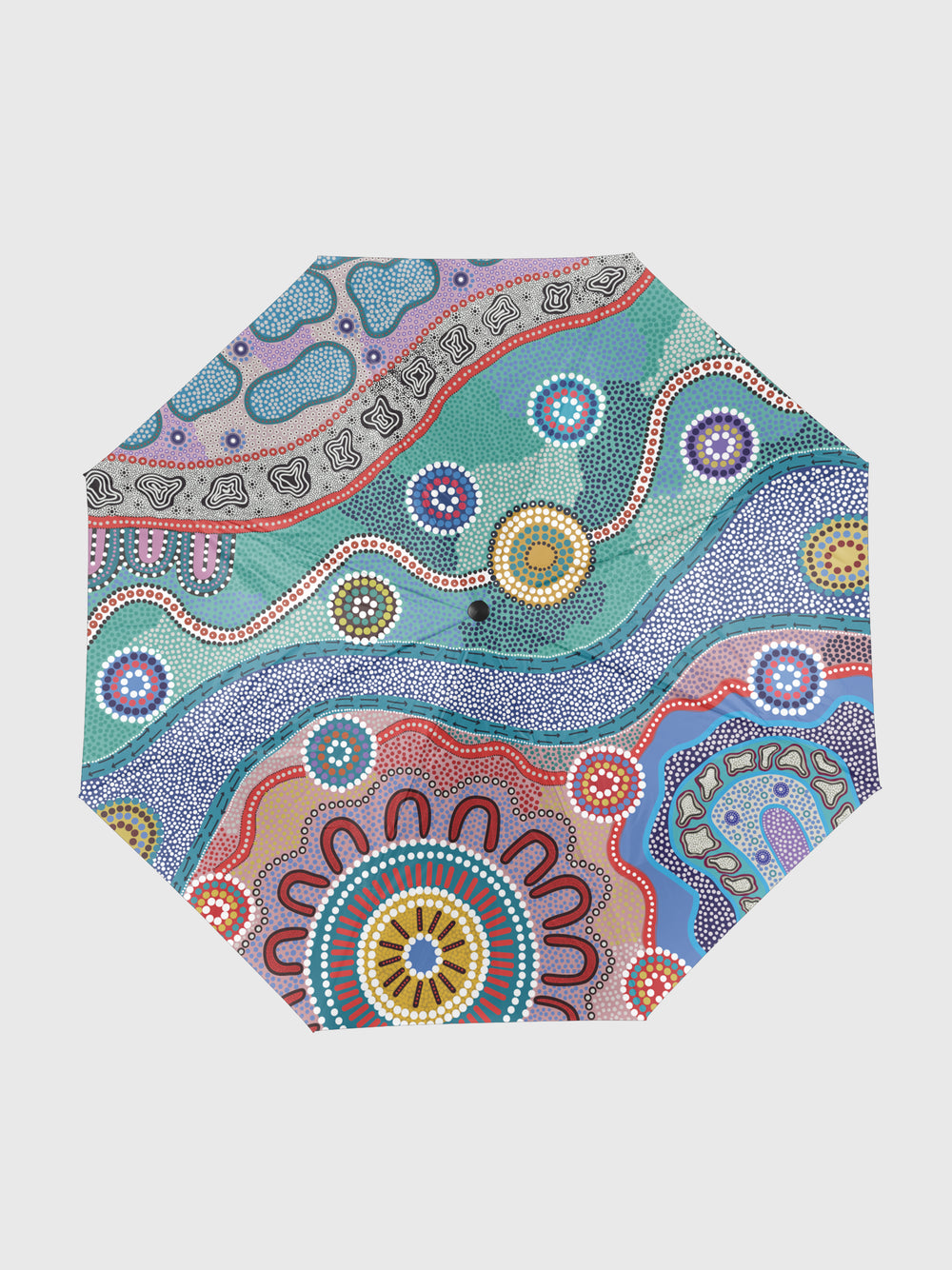 Our umbrellas showcase vibrant artwork from our talented First Nations artists on high-quality pongee fabric. Engineered for reliability, these umbrellas feature a superior wind-vent system and robust fibreglass frame that stands up to challenging weather.