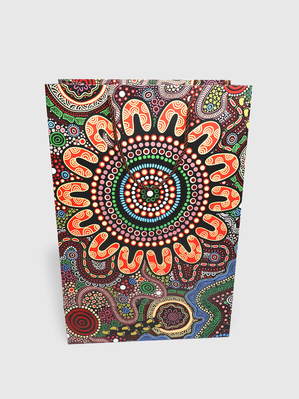 Wrap your gifts in style with our Indigenous Australian art gift bags. These sturdy beauties are made from 250 gsm coated paper and come in a handy size - perfect for most pressies. Each bag showcases stunning designs from First Nations artists, adding an extra special touch to your gift-giving. The best part? Every purchase supports Indigenous artists, so you're giving twice! Whether it's for a birthday, Christmas, or just because, these bags are sure to impress.