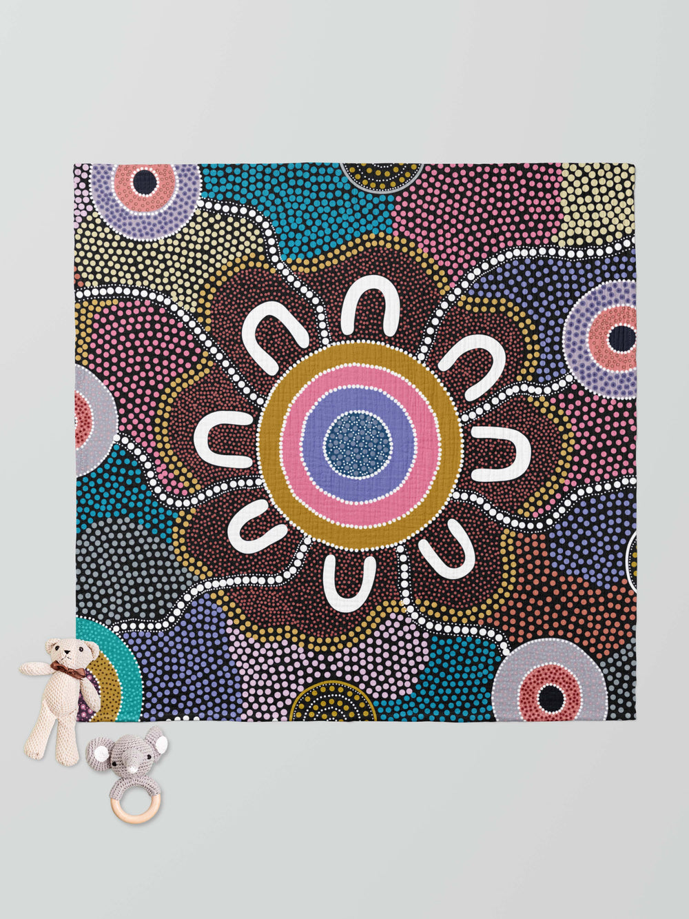 Yvonne's deep-rooted connection to her Boodja and the invaluable teachings from her mother serve as the primary inspirations behind her artwork. As a child, living amidst nature in the bush, she learned invaluable lessons on caring for Country, being observant of its wonders, and appreciating its bounty without taking it for granted. Her mother imparted wisdom on gathering bush food and the art of thriving on Country. Yvonne's artwork bursts with bright hues, mirroring the vivid colours of her homeland, from the bright wildflowers to the vivid crystal blue waters. Each stroke of her brush is a tribute to her mother and a canvas of family memories.