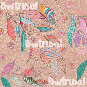 Inspired by Yvonne's love of Eucalyptus trees, the varied palette ranges from earthy browns and greens to bright pinks and blues, painting a picture of the changing seasons and the dynamic nature of the Australian bush. The concentric circles scattered across the canvas might be interpreted as waterholes, campfires, or meeting places. 'Bush Leaves' is not just a visual treat but also an ode to Yvonne's deep-rooted connection to her Country and the natural wonders it beholds.