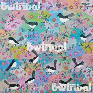 The Djitty Djitty (Willy Wagtail) appears frolicking among intertwining branches and floral motifs. The artwork radiates a sense of joy and liveliness, evident in the birds' playful postures and the vivid palette of blues, pinks, and yellows. The background, dotted with a medley of hues, evokes the texture of a dreamy sky during twilight. Blooming flowers and distinct leaves further add layers of depth and intricacy to the scene.