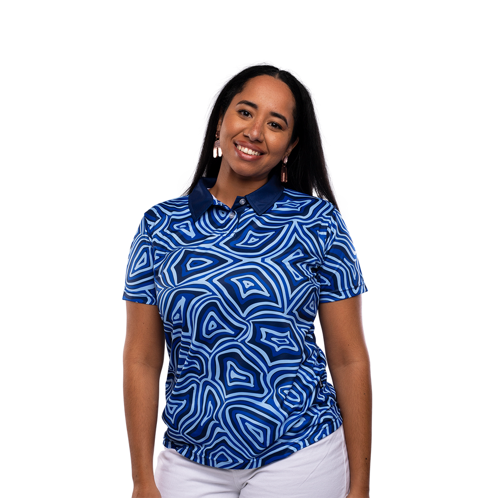 Made with Coolpass polyester, our Aboriginal art women's polos provide UPF 50+ protection and resists fading. The moisture-wicking, odour-resistant properties make it perfect for long-term outdoor use. They're lightweight, durable, and quick-drying. Plus, no ironing required. And the biodegradable packaging shows our commitment to protecting the land. Stay cool, stylish, and sustainable with our women's polos! 100% ally-friendly!
