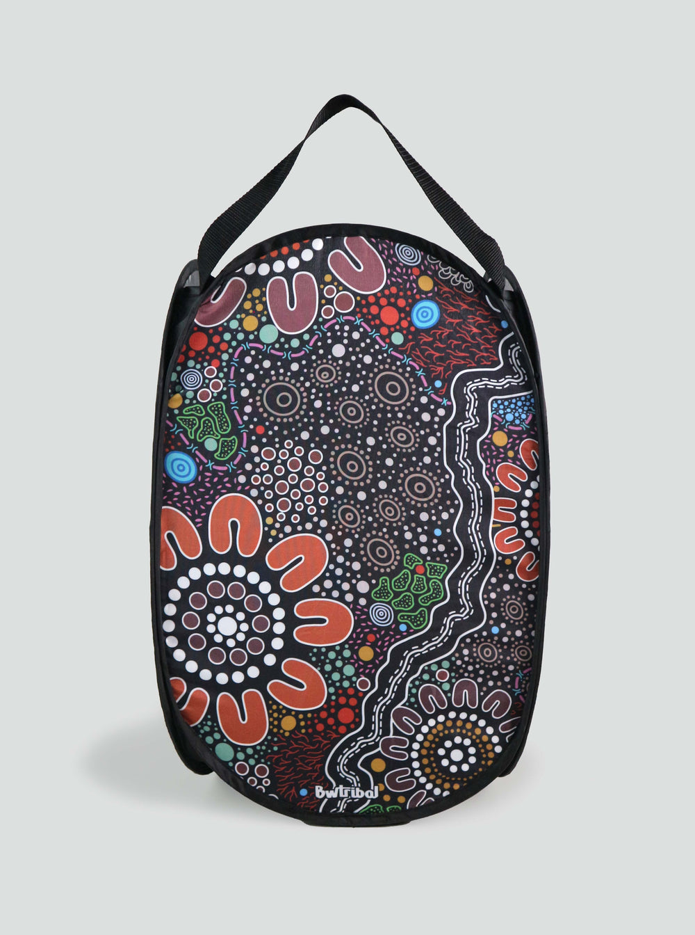 Our compact pop-up hampers (35x54cm) feature authentic Indigenous art, adding a splash of culture to your home organisation routine. Made of lightweight polyester and weighing only 100g, they're easy to set up, use, and store. These versatile hampers are perfect for small spaces, offering both style and practicality.