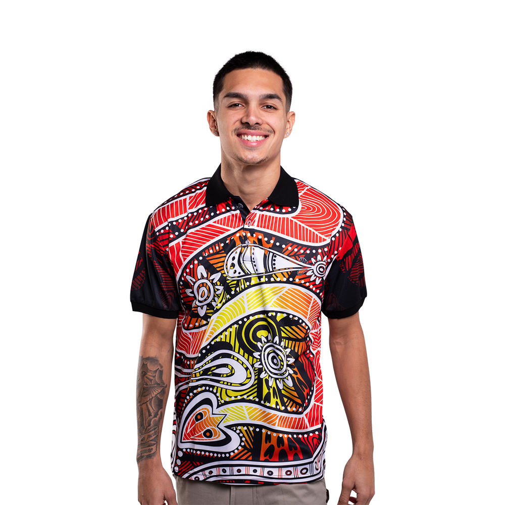 Made with Coolpass polyester, our Aboriginal art men's polos provide UPF 50+ protection and resists fading. The moisture-wicking, odour-resistant properties make it perfect for long-term outdoor use. They're lightweight, durable, and quick-drying. Plus, no ironing required. And the biodegradable packaging shows our commitment to protecting the land. Stay cool, stylish, and sustainable with our men's polos! 100% ally-friendly!