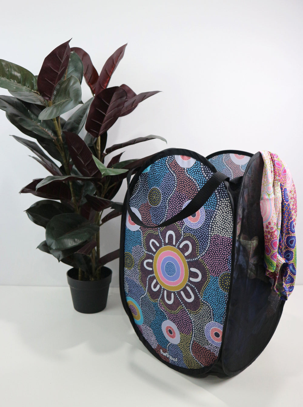Our compact pop-up hampers (35x54cm) feature authentic Indigenous art, adding a splash of culture to your home organisation routine. Made of lightweight polyester and weighing only 100g, they're easy to set up, use, and store. These versatile hampers are perfect for small spaces, offering both style and practicality.