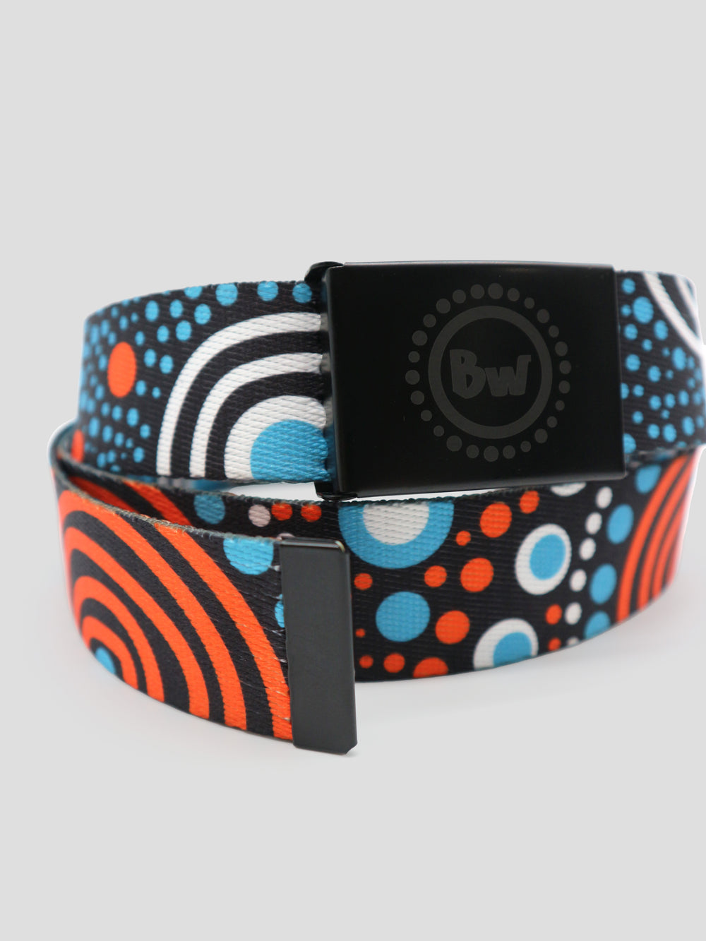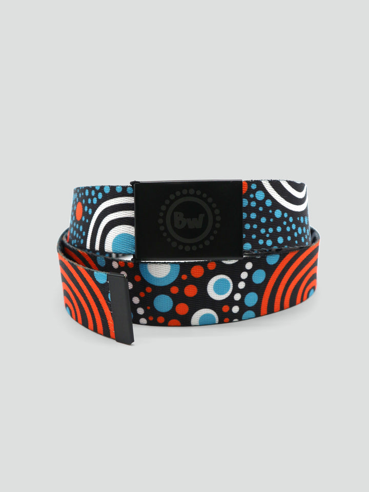 Get ready to buckle up in style with our belts! This 150cm long polyester belt features a sturdy iron buckle, with our logo engraved for that extra touch of flair. Don't settle for boring belts - stand out with Aboriginal art belts!