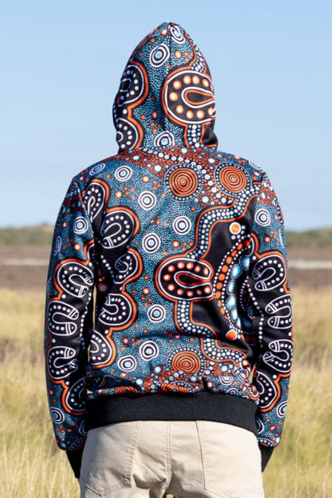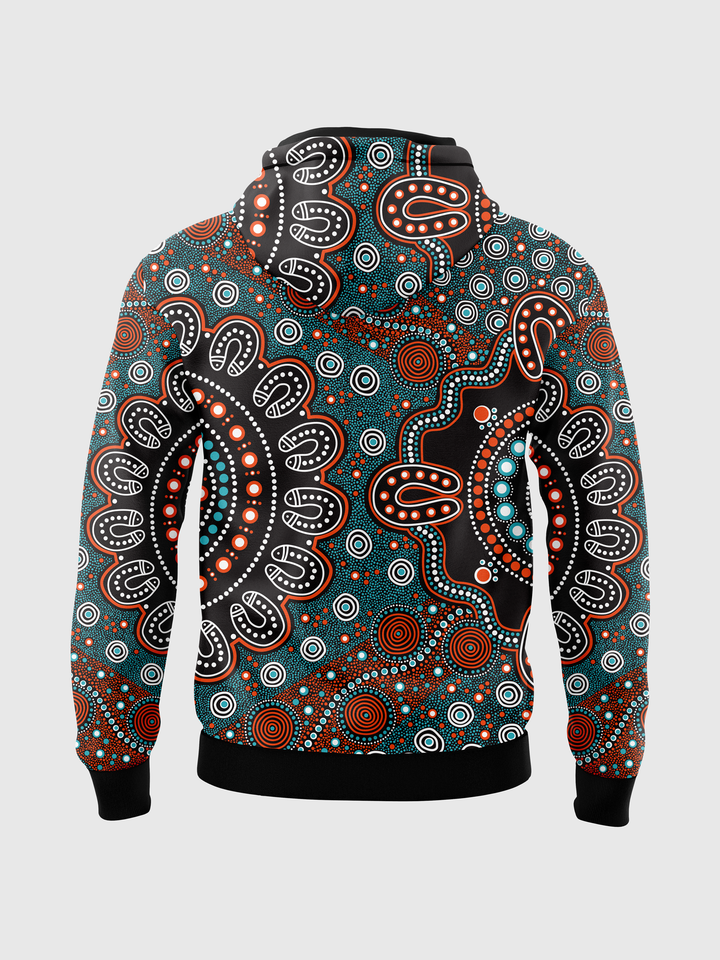 Our super comfy Indigenous artwork printed hoodie are made from quality intertwined fleece (280gsm) and feature a handy kangaroo pocket to keep your hands warm or stash your essentials. It's the perfect way to show your support for First Nations culture while staying snug.