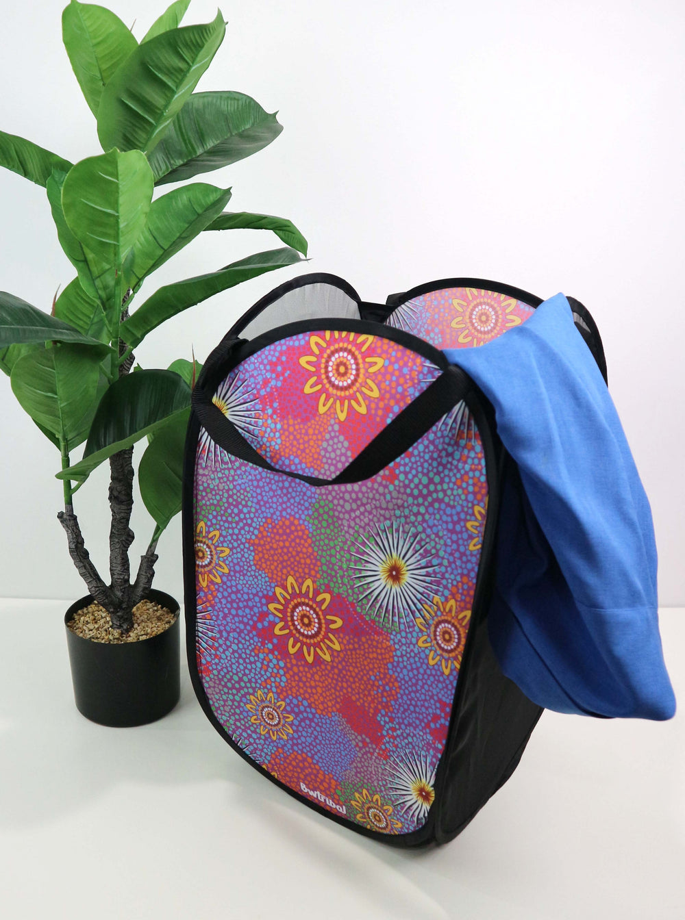 Our compact pop-up hampers (35x54cm) feature authentic Indigenous art, adding a splash of culture to your home organisation routine. Made of lightweight polyester and weighing only 100g, they're easy to set up, use, and store. These versatile hampers are perfect for small spaces, offering both style and practicality.