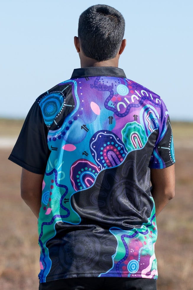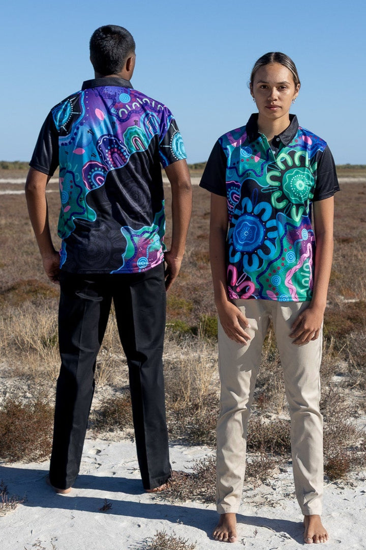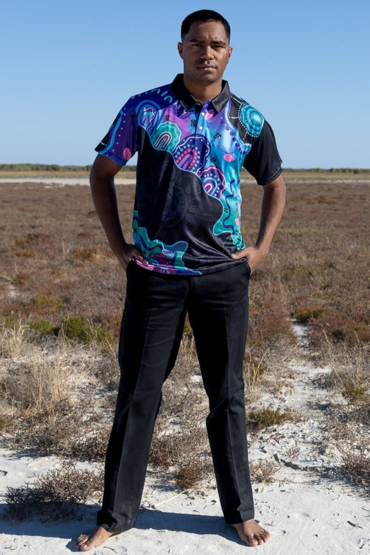 Made with Coolpass polyester, our Aboriginal art men's polos provide UPF 50+ protection and resists fading. The moisture-wicking, odour-resistant properties make it perfect for long-term outdoor use. They're lightweight, durable, and quick-drying. Plus, no ironing required. And the biodegradable packaging shows our commitment to protecting the land. Stay cool, stylish, and sustainable with our men's polos! 100% ally-friendly!