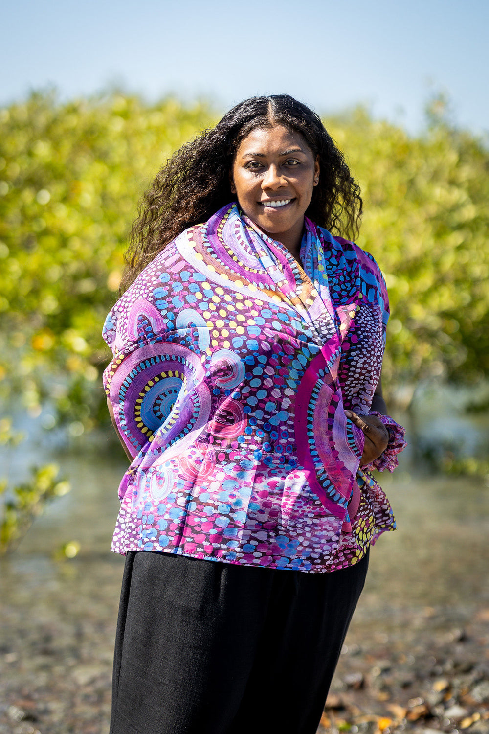 Bobbi Lockyer is a celebrated multidisciplinary artist and a mother to four incredible boys. A proud Ngarluma, Kariyarra, Nyulnyul, and Yawuru woman, Bobbi's connection to her Country and community is profound, and she channels this bond through her extensive art, fashion design, and photography portfolios.