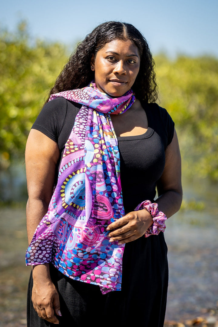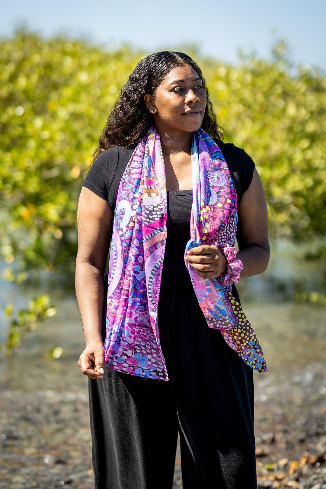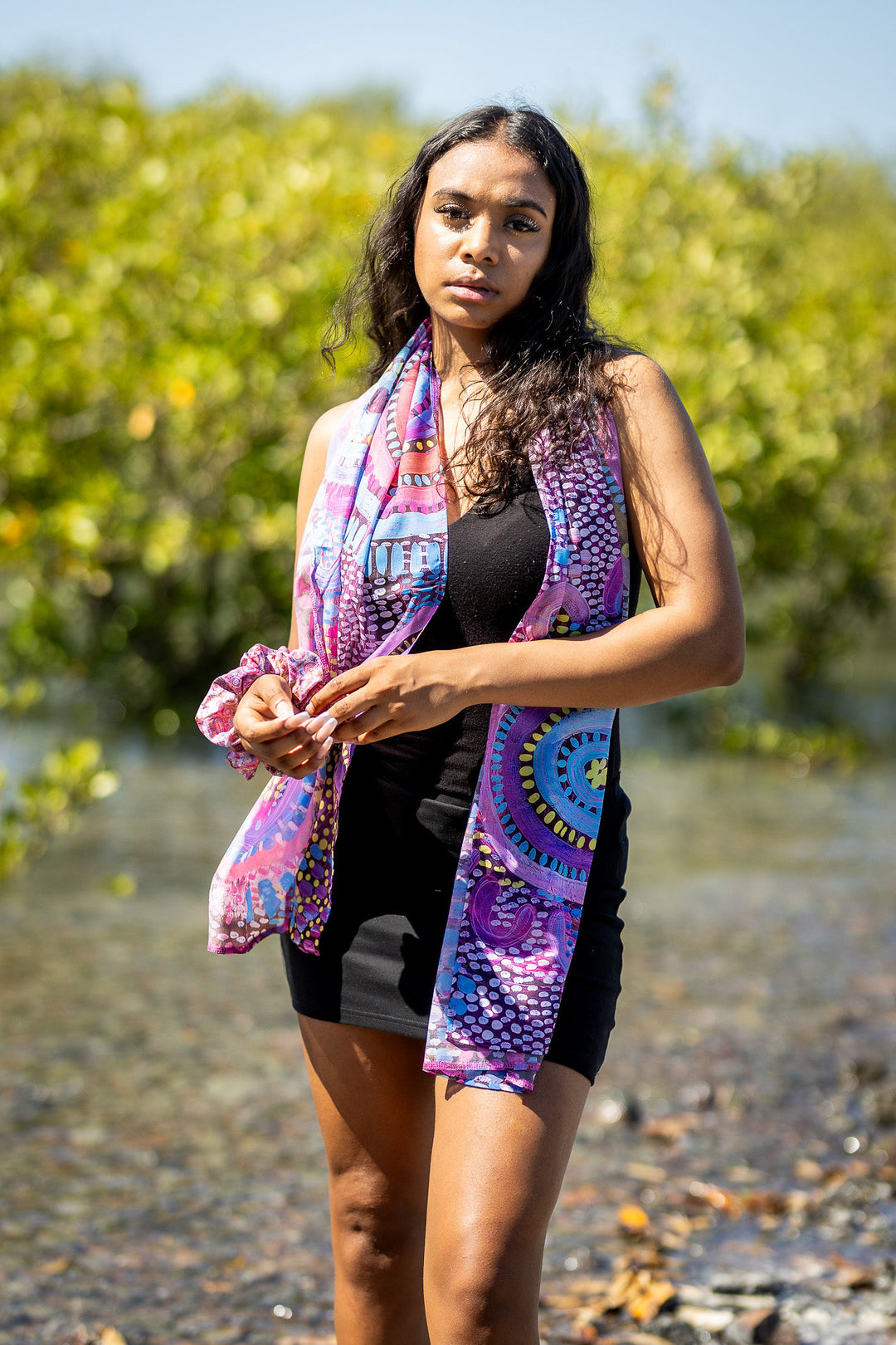 Our Indigenous art scarves measure a generous 180x60 cm, offering versatile styling options for any outfit. Crafted from a lightweight polyester and chiffon blend, these scarves drape beautifully and provide comfort in any season. Perfect for adding a pop of colour and meaning to your outfit, these scarves are wearable art. Whether draped over your shoulders, tied as a headscarf, or adorning your bag, these versatile pieces allow you to carry a piece of Indigenous culture with you wherever you go.