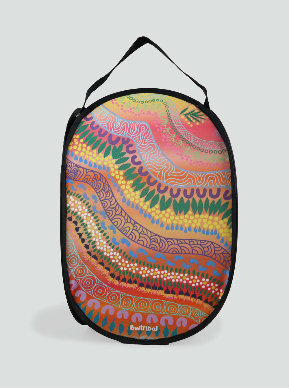 Our compact pop-up hampers (35x54cm) feature authentic Indigenous art, adding a splash of culture to your home organisation routine. Made of lightweight polyester and weighing only 100g, they're easy to set up, use, and store. These versatile hampers are perfect for small spaces, offering both style and practicality.