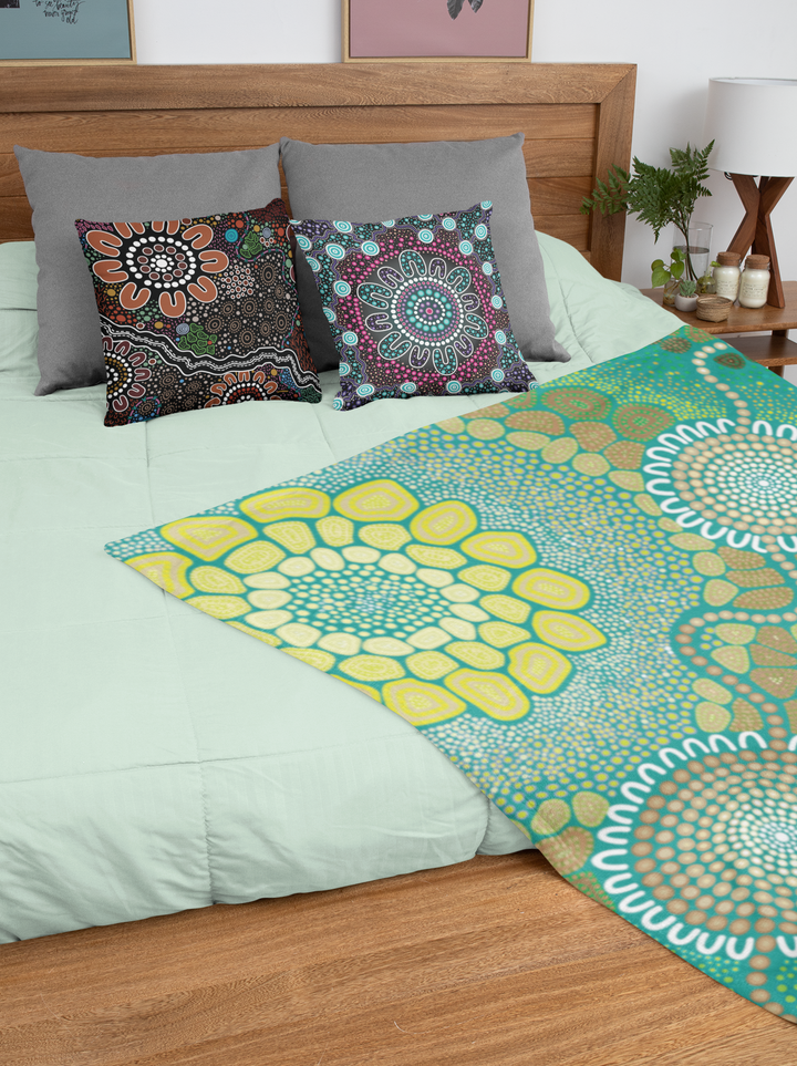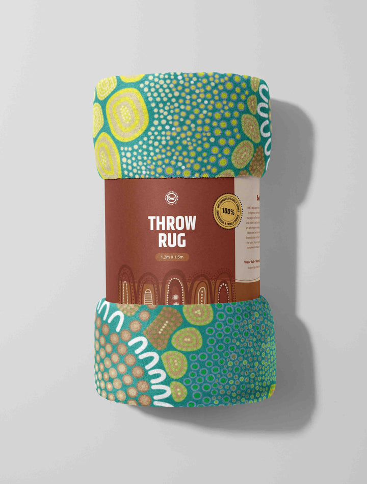 Our throw rugs/throw blankets are ready to add a touch of warmth, style, and culture to your home. Measuring a generous 1.2 x 1.5 metres and comprised of flannel polyester, our throw rugs are perfect for draping over your couch or laying out for a cosy movie night. Every throw rug in BW Tribal's collection showcases authentic Indigenous artwork from our team of talented First Nations artists.